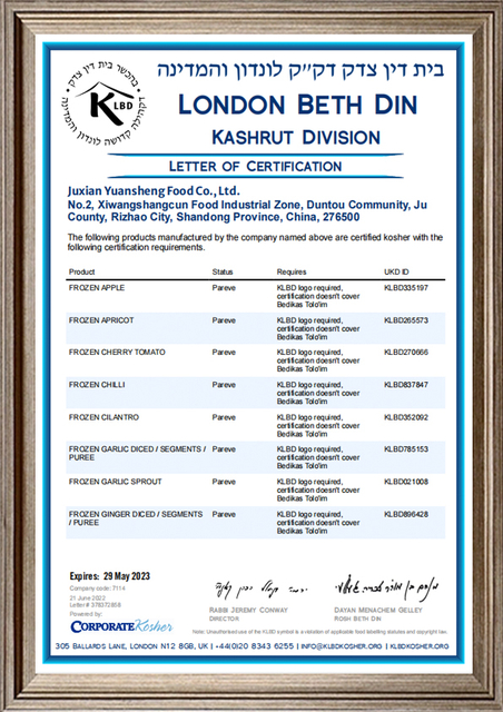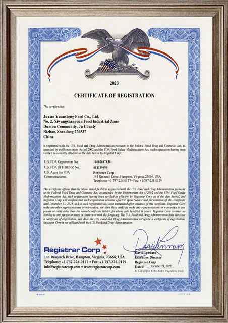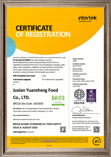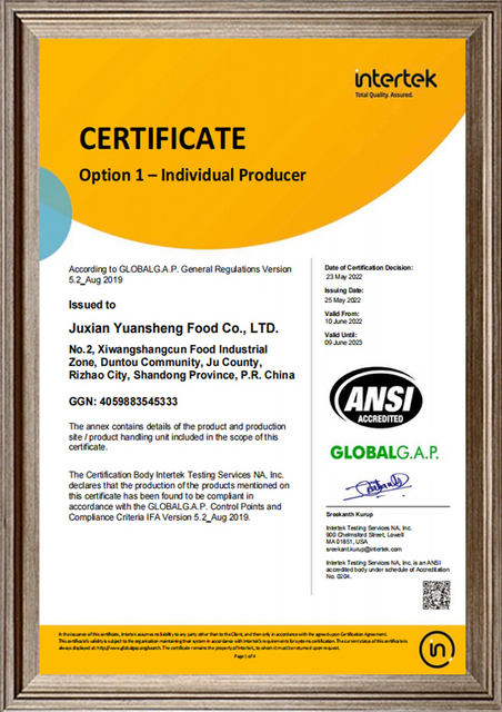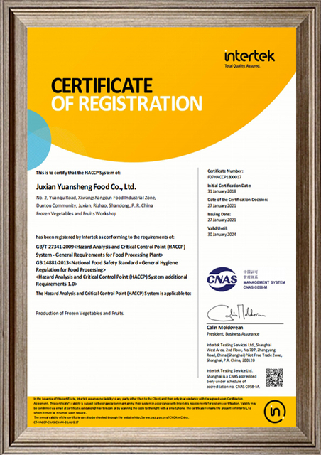 Juxian Yuansheng Food Co., Ltd. wurde 2016 gegründet, ein privates Aktienunternehmen für den Export von Tiefkühlgemüse.